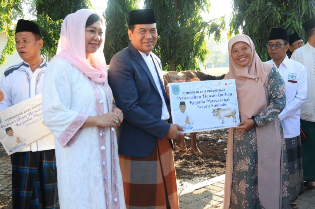 Mayangan – Penjabat Wali Kota Nurkholis bersama istri Dewi Maharani secara simbolis menyerahkan 1 ekor sapi bagi Muslimat NU Kota Probolinggo. Kegiatan ini dilakukan di depan halaman Masjid Agung Raudlatul Jannah usai salat Idul Adha, Senin pagi (17/6).